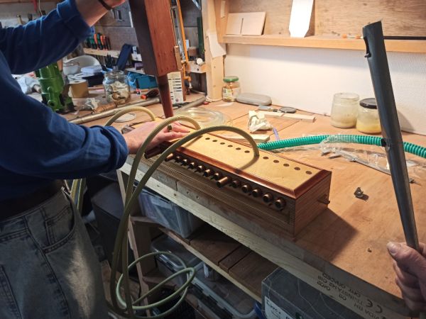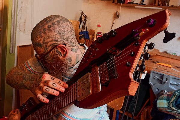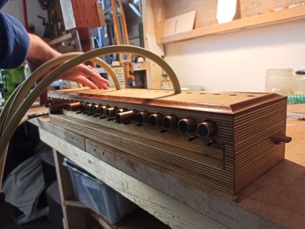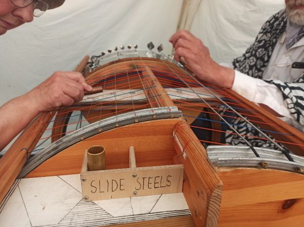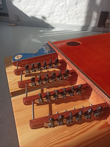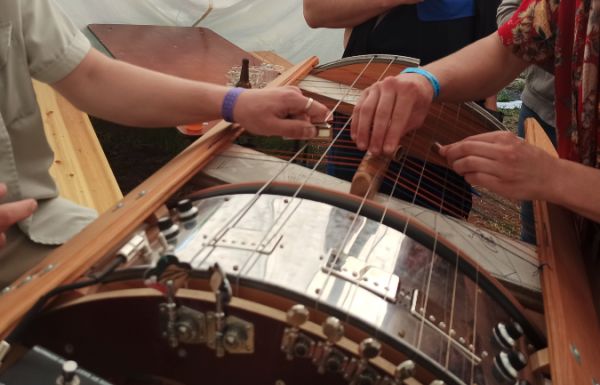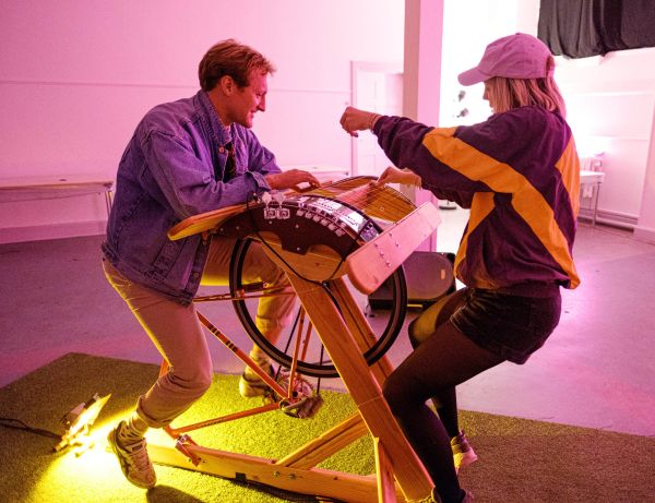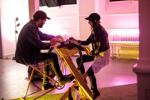 The Bicyclelyre is a bike wheel driven instrument played with slide steels. The instrument can be played by several musicians though only one controls the speed of the wheel. The one pictured here is the first prototype. It has since then been upgraded and excibited at Festival of Endless Gratitude 2020 in Copenhagen, Denmark. All photos from that event taken by Jan Jespersen Photography